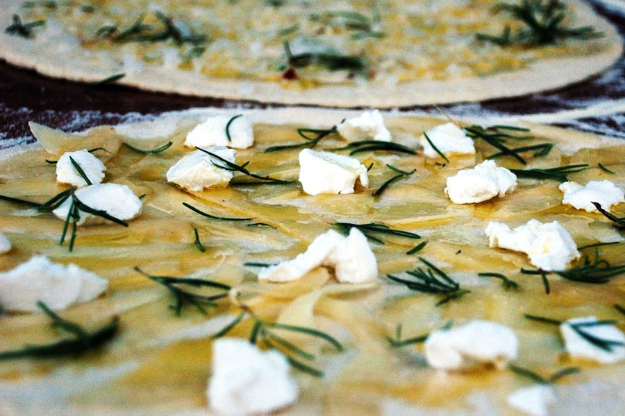Heat pizza stone while dough rises at least 45 minutes before baking pizza, put stone on oven rack in lower third of oven and preheat oven to 500℉. Shape dough by dusting with flour, then transfer to a pizza peel or large baking sheet. Pat out dough evenly with your fingers and stretch into a 14-inch round, re-flouring fingers if necessary. Assembling the pizza: using a vegetable peeler, begin slicing the potato over the pizza dough. Be sure to cover the dough in a single thin layer. Next, top the dough with small dollops of the ricotta. Sprinkle the rosemary, red pepper flakes and sea salt over the potato slices and ricotta. Top with extra virgin olive oil.