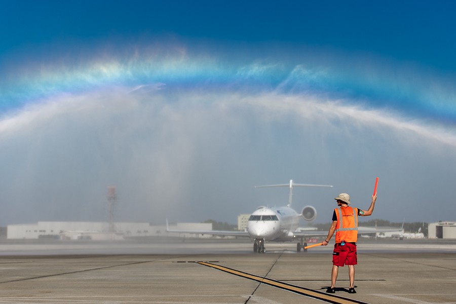 Pictured: Elite Airways' inaugural flight from Portland, ME to SRQ arrives. Photo by Wyatt Kostygan.