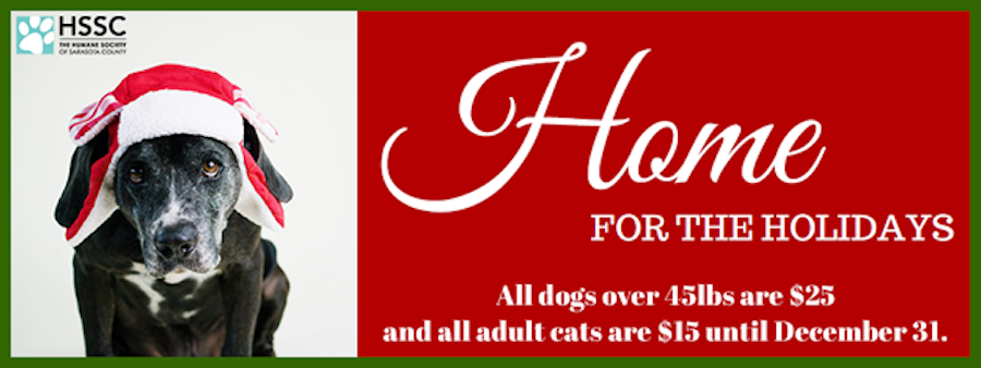 This holiday season, the Humane Society of Sarasota County (HSSC) has reduced adoption fees to just $25 for dogs over 45lbs and $15 for all adult cats. HSSC’s adoption fee includes a comprehensive medical exam, vaccinations, spay or neutering, deworming, microchipping, and a free first exam at the Animal Clinic of the Humane Society of Sarasota County. The promotion runs the entire month of December. Visit www.hssc.org/adoption/ to see all available pets, and bring a pet home for the holidays.