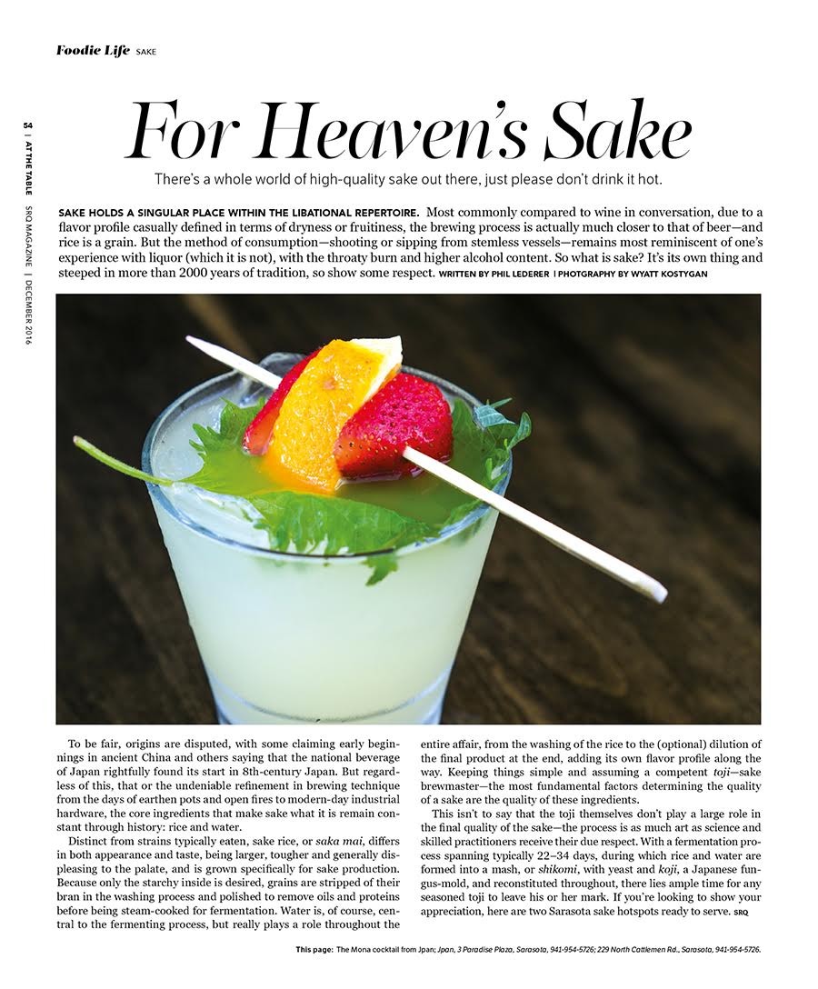 This month in For Heaven’s Sake, indulge in a product whose process of manufacturing is just as much a science as it is an art. Venture alongside writer Phil Lederer as he learns what it takes to be a toji, or sake brew master, how to determine the overall quality of sake (it’s all about water and rice) and where to find the best brews both here and abroad. Just don’t ask for it hot.