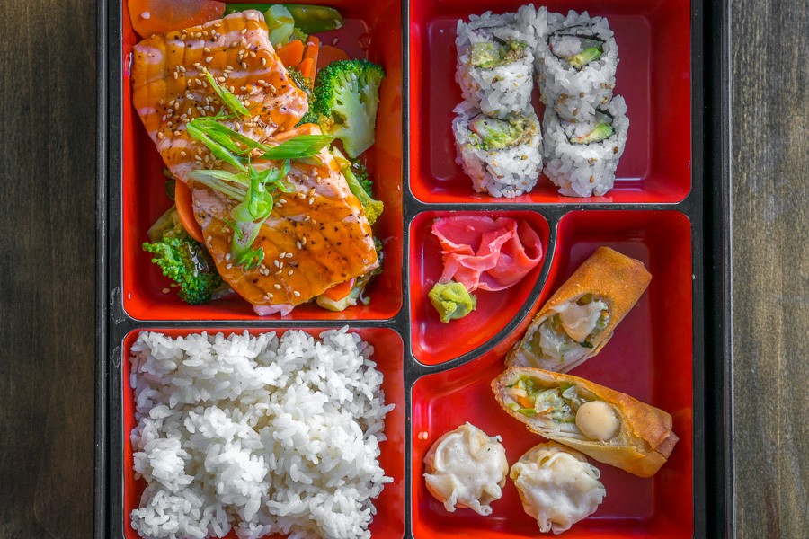 Indecision, indecision; what to order when looking through the endless delectable morsels on the Jpan menu? Why not get a little bit of everything? Hit up the new UTC location for lunch and feast your eyes on the salmon teriyaki bento box—with a nook for each part of the meal, it's just the right amount for a filling, but not heavy, imbibe on your lunch hour. Baby pink wild Scottish salmon simmered in miso sits on a pillow of veggies in one cranny, white rice next door and four generously cut California rolls rest in the next. One square over, two slivers of spring rolls with a dollop of white sauce hang out next to steamed shrimp shumai. Top it all off with your choice of warming miso soup or a health-conscious ginger salad.