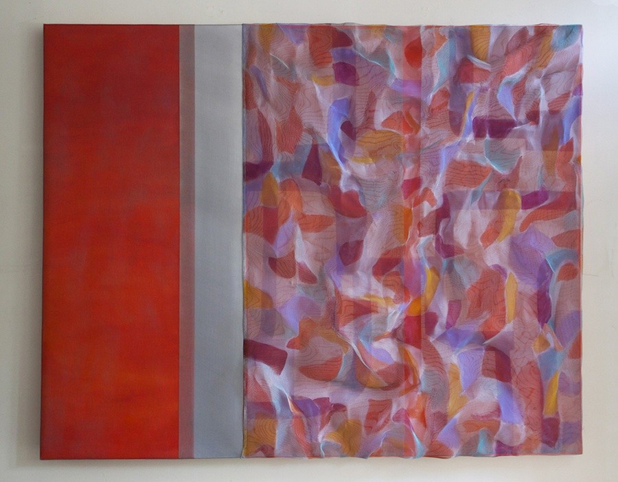 Sculpted over the face of the base painting, the mesh rises and falls, varying the distance between canvas and mesh and the angle of the light peering through to the colors below, while overlaps in the mesh create moire patterns to entrance the eye. Manipulating the light through the mesh, Konkel creates constructive and destructive interference in the travelling light waves, which in turn either enhance the illuminative effect or lessen it. This gives the work a dynamic quality, whereby different angles of approach offer distinctly different experiences depending on the light. By adding paint to the mesh itself, a whole new layer enters the equation.