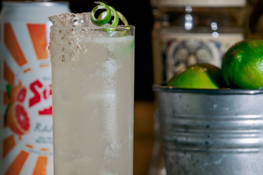 Ingredients: ½ oz. grapefruit rose liquor; 2 oz. tequila (State Street uses Espolón); 1 oz. lemon juice; Stiegl Radler; spicy salt.