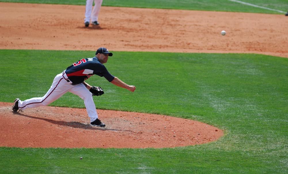 Pictured: Braves Pitcher Tim Hudson delivers a pitch during spring training at ESPN Wide World of Sports.