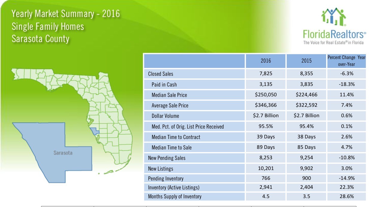 According to recent data from Florida Realtors Industry Data and Analysis department, Sarasota and Manatee counties wrapped up 2016 with fewer distressed sales, an increase in traditional closed sales, an expanding inventory and higher median prices as compared to the year before.