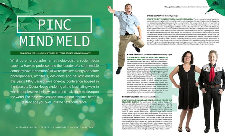 What do an artographer, an ethnobiologist, a social media expert, a Harvard professor and the founder of a submersible company have in common? We catch up with all of the innovative speakers from the 2016 PINC conference in PINC Mind Meld. Read about the commonalities between humans and bears, the science of sexual connection and the need for hands-on classes in schools—all in February's PINC feature.