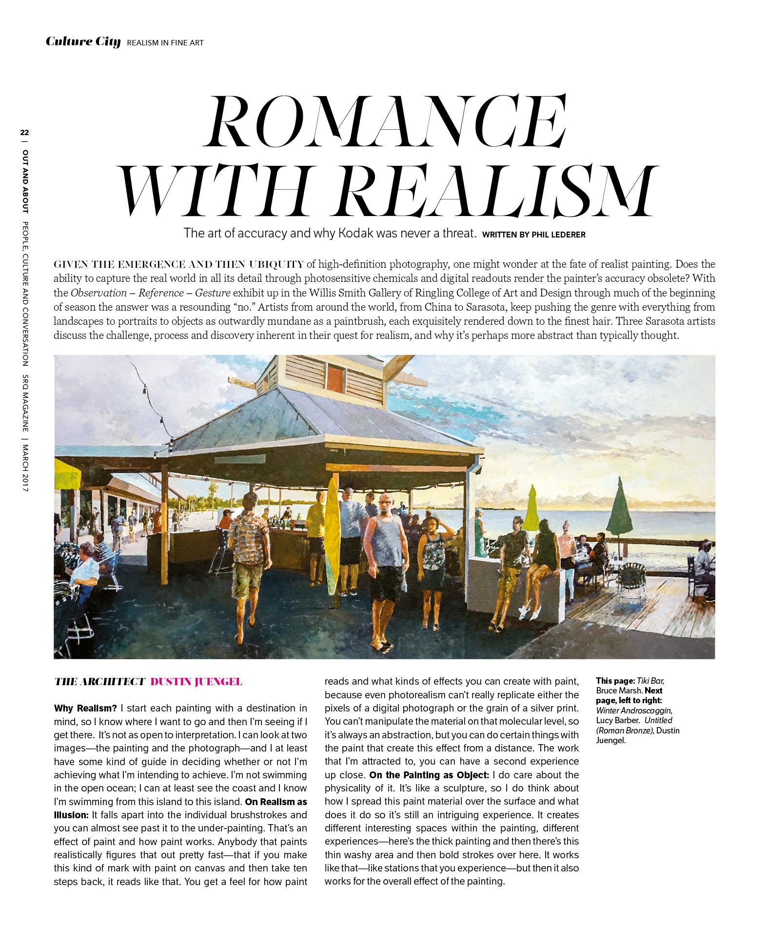 This month, staff writer Phil Lederer goes deep with three local painters practicing the art of realism. Personalities emerge through each individual artistic ethos—Dustin Juengel is the Architect while Brian Marsh emerges as the Idealist and Lucy Barber as the Seeker. Read about each young artist's musings on imagination, abstraction and illusion in Romance with Realism.