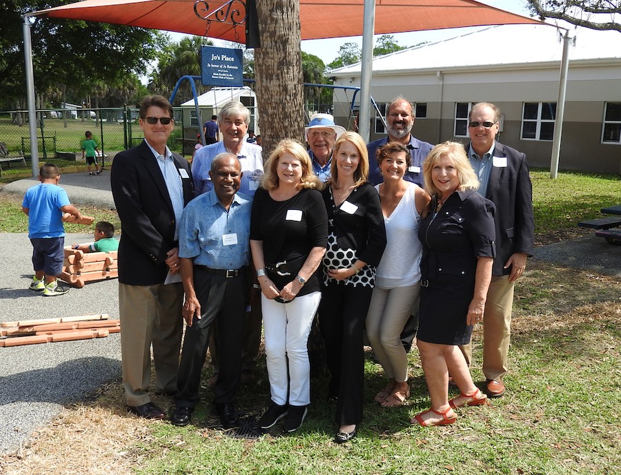 This winter, Children First requested a grant of $8,000 from the Rotary Club of Sarasota to make improvements to the playground at its Orange Avenue headquarters. The Rotary Club funded the request in full, enabling Children First to install a "Merry-Go-Cycle," a magnet wall, and large timber stackers. The new equipment, which is being used by children ages 3-5 years old, is developmentally appropriate and encourages children to learn through play as well as helps them to develop fine and gross motor skills. After the items were installed, Children First used the opportunity not only to thank the Rotary Club but also to honor a longtime supporter. Jo Rutstein served on the Children First board of directors from 2009-2014, serving as board chair in 2012. She and her husband, Stan, have been wonderful supporters of Children First for many years – as donors, co-chairs of events, and friends. To honor Jo's contributions, Children First installed a sign near the new playground equipment, naming the area "Jo's Place." The recent dedication was attended by numerous Rotary Club members and Children First board and staff members.