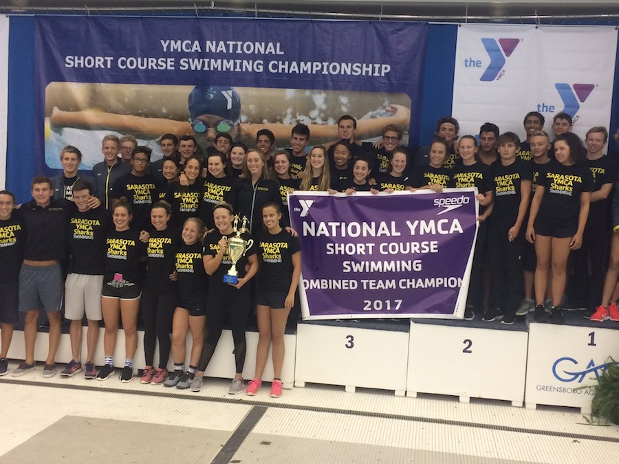 The Sarasota YMCA Sharks Swim Team won the 2017 YMCA Short Course National Championships held in Greensboro, North Carolina on April 3–7. Over 70 teams competed in the four-day event which featured swimmers ages 12 to 18. The Sharks have won 16 YMCA National Championships since the late 70s and 2017 marks their third consecutive win. “We are proud of the hard work and dedication that our swimmers bring every day at practice and to our meets,” said Brent Arckey, head coach of the Sharks swim team. “This meet was particularly exciting as the Men’s 100 backstroke, Men’s 400 Medley Relay and Men’s 800 Free Relay broke National YMCA records!”
