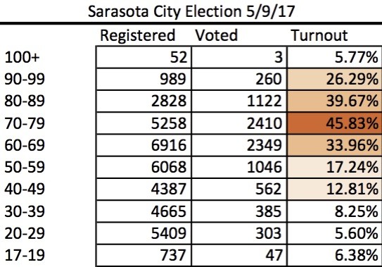 While younger voters make a larger percentage of voters in the City of Sarasota, they continue to make a small portion of the electorate participating in city elections. While registered voters in their 20s now outnumber voters in their 70s, nearly eight times as many voters in their 70s cast ballots than voters in their 20s in a May 9 Sarasota City Commission election. That's according to SRQ's most recent Where The Votes Are analysis of election returns.