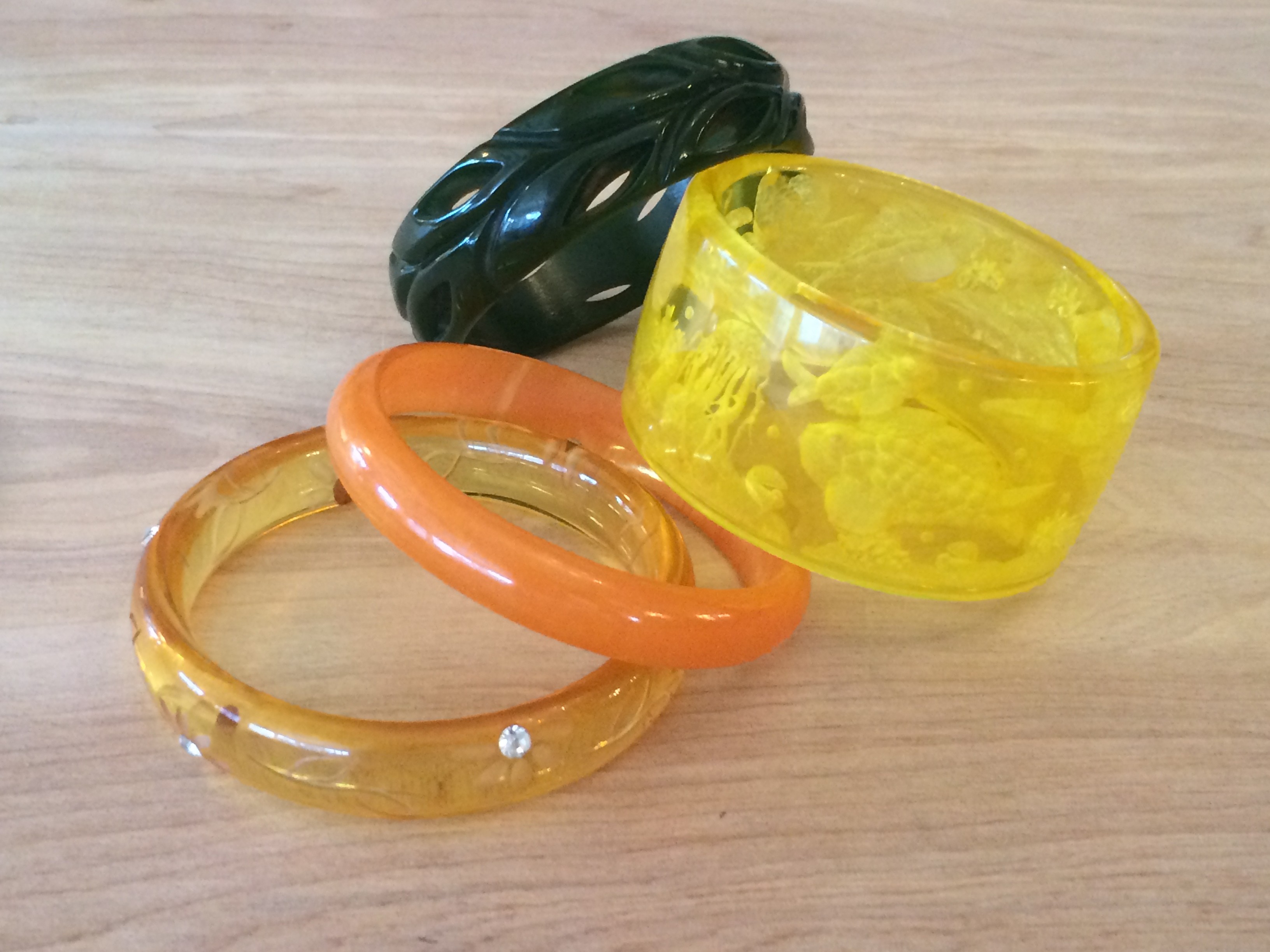 A quintessential blue bungalow with a silver trailer parked out front, Canned Ham Vintage holds racks stuffed with vintage dresses, jackets and shirts, hats propped up to the ceiling and retro furniture making for kitchen and living room vignettes. In the center of the packed and colorful bungalow sits a display of jewelry. Amongst the assortment, an especially eye-catching piece shines through, a yellow bakelite bangle. The translucent plastic, a classic of the 1940s, stands out due to a seascape of fish, seaweed, jellyfish and other aquatic creatures carved into it by a local artist. Now a dying art, carving into the bakelite poses as a hazard because the artist would breathe in loose pieces of the plastic. As a result, few artists remain, making Canned Ham’s carved bangles a rarity and lucky find. It can be shown off on its own or paired with others but regardless of how you choose to wear it, the bangle proves as a pop of color and perfect accessory for any outfit, vintage or modern.