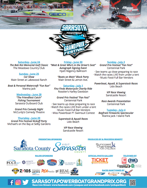 The 33rd Annual Sarasota Powerboat Grand Prix Festival returns June 24-July 4 with events for the entire family to enjoy. Powerboat and AquaX Pro race teams will compete for the checkered flag on July 1 and 2 just off Lido Beach with televised coverage to over 100 countries beginning late July. New events this year include a Grand Prix Comedy Night at McCurdy’s Comedy Theatre, a venue change for the Festival Kickoff Party to Michael’s on the Bay at Selby Gardens, and a Grand Prix Fan Fest on July 1 and 2 in the Van Wezel parking lot. The Fan Fest is free with Suncoast Charities for Children producing the entire Festival, including the July 4th Bayfront Fireworks.