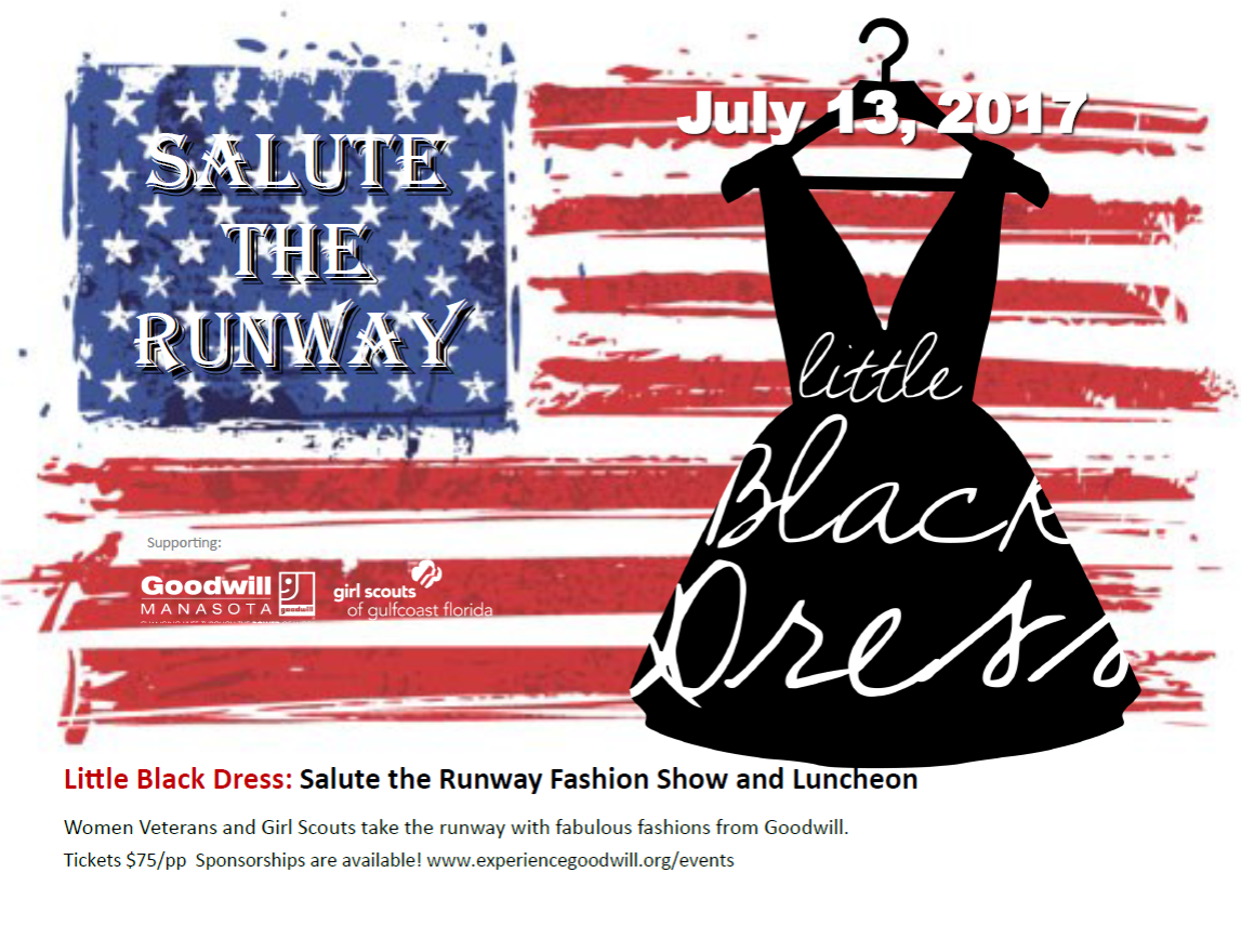 through the Goodwill Manasota Veterans Task Force to recycle dresses from Goodwill and put together an amazing fashion show. The Girl Scouts are in charge of the creativity as they will be pulling items from Goodwill’s donations and the veterans will be modeling the ensembles. Join us at the Hyatt July 13 and discover the unique creations of these wonderful students while supporting a good cause!