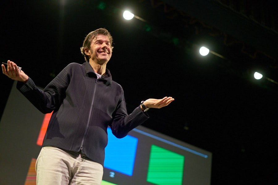 Pictured: Stefan Sagmeister works the audience at PINC Sarasota 2017. Photo by Wyatt Kostygan.