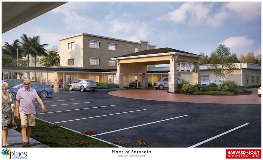Pines of Sarasota Foundation President Janet K. Ginn and Pines of Sarasota President/CEO Mike Ward announced a reimagining and renovation of Pines’ Assisted Living Facility and a partnership with the Esther & Harold Mertz Foundation. The renovation is the first step in the transformation of Pines of Sarasota’s campus and the beginning of the next phase in the life of the nearly 70 year-old senior care community. The Assisted Living building, the first facility of its kind in Sarasota, was built in 1989 to provide seniors with independence within a supportive environment. The renovation will modernize the facility offering residents more privacy and a broader variety of room configurations while maintaining the high quality of service and care for which Pines of Sarasota is known. In addition to the changes to resident rooms, Pines’ signature porte cochere will be added to a newly configured entrance that will welcome visitors and residents and shield them from inclement weather. Funding for the $3.9 million project will be supported by the Esther & Harold Mertz Foundation, which will match all donations on a 2:1 basis. In a show of faith in Pines of Sarasota Foundation and the generosity of the community, the Mertz Foundation has already contributed $2.6 million in matching funds.