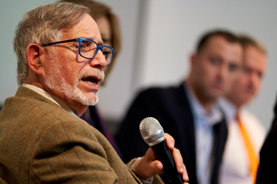 Pictured: Newgate Montessori Head of School Tim Seldin addresses the crowd at the RocketKids Modern Education Symposium. Photo by Wyatt Kostygan.