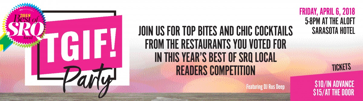 Join us to celebrate the winners and finalists of this year's Best of SRQ Local Readers Competition at the Best of SRQ Local TGIF Party on Friday, April 6, 2018 at Aloft Sarasota Hotel from 5-8pm. Meet the restaurants who topped the charts and garnered the most reader votes to sample their award-winning dishes and cocktail pairings. Thank you to 20th Anniversary Partner Ringling College of Art and Design and TGIF host Aloft Sarasota Hotel.