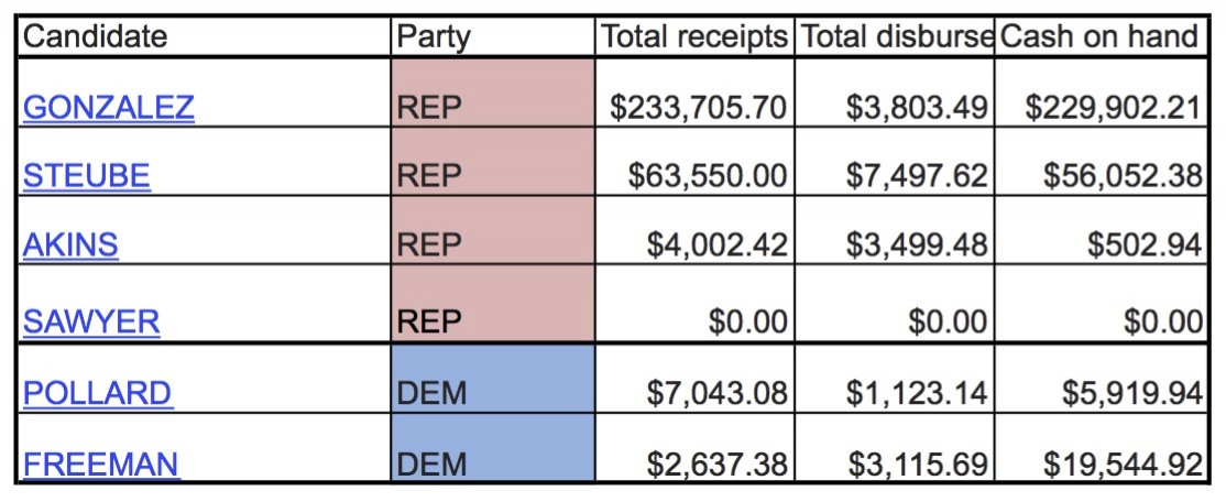 While Gonzalez built his warchest with more than 60 contributions from individuals, predominantly smaller checks, Steube pulled in hearty loads from larger donors and groups.