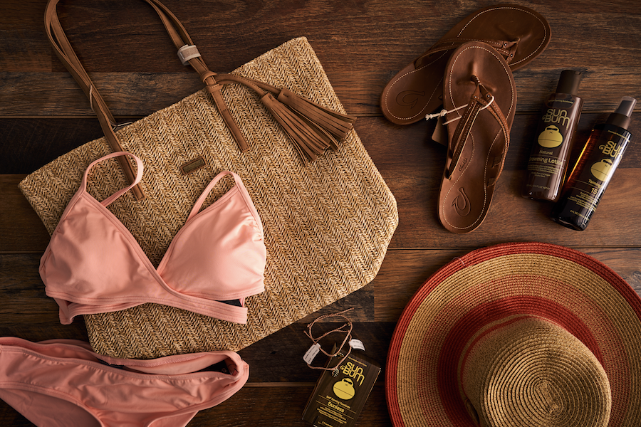 Protect your pretty hairs with the Panama Jack Straw Hat, which boasts a UPF50+ rating on its close-weave material, blocking 97% of the sun’s UV rays. The OluKai U’I Sandal is crafted of the finest materials from Hawaii, making them the most durable, comfortable flip flops you’ll step into, we reckon. Get yourself a pre-tan before you jetset, with the SunBum Self-Tanning towelettes for a healthy glow. PuraVida Gold Bitty bracelets and the Sun N’ Sand Poly Straw Tote give the outfit a touch of island flare. The Peony colored Vince Camuto Cruise bikini exudes an effortless appeal to combo your bronze from the SunBum Natural Browning Lotion. Not to mention, Swim City recently got in a slew of new stylish cover-ups to throw in the mix.