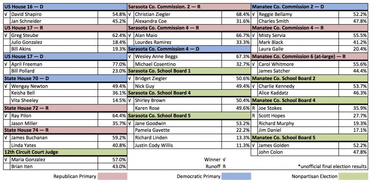 In several key state House races, former state Rep. Ray Pilon won the Republican primary in District 72, where he will challenge incumbent Democrat Margaret Good in November. In District 74, Republican James Buchanan beat North Port Commissioner Linda Yates in a party primary for Gonzalez’s open seat.