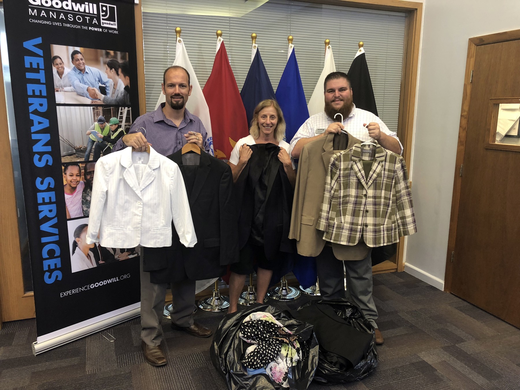 On July 4th, Elaine Mellon lost her father, who served in the U.S. Army during the Korean War. Robert "Bob" Mellon had just recently celebrated his 85th birthday and 66th wedding anniversary when he passed; Elaine wished to find a suitable way to honor his life and legacy. She remembered information she had heard during a Goodwill Manasota "Lunch & Learn" program about its Veterans Services Program – how veterans are helped to reintegrate into civilian life – and decided to collect men's and women's business suits for veterans seeking new or better jobs. Recently, she dropped off numerous large bags of clothing to the Veterans Services Program offices.