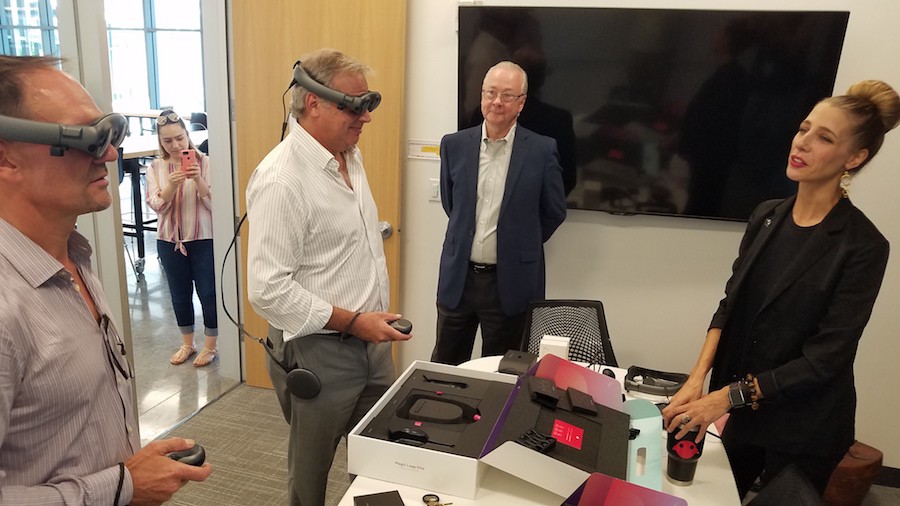Pictured: Shanna De Iuliis (right) leads Ringling faculty and staff through a session with the Magic Leap One headset and controller. Photo by Rich Schineller.