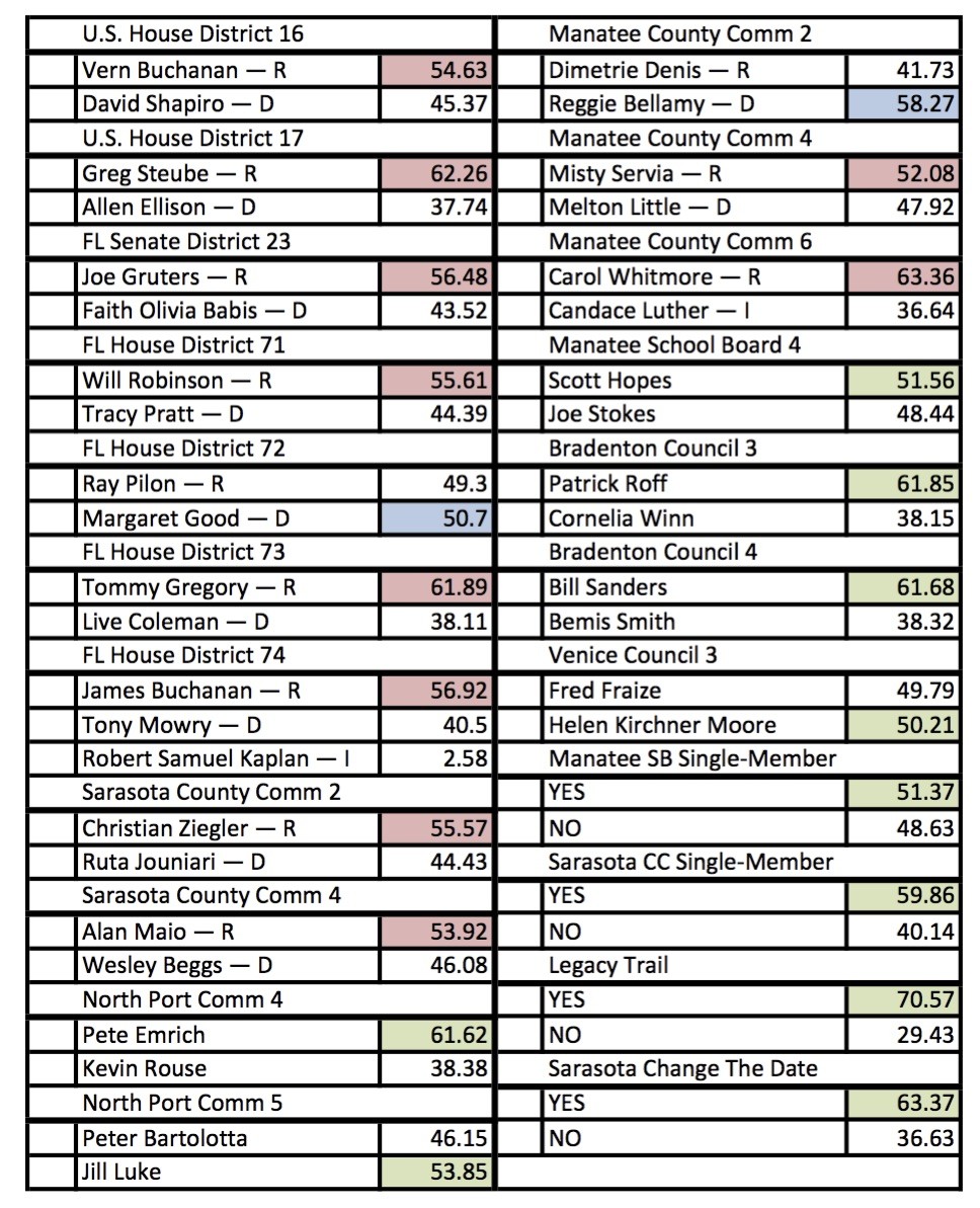 In Manatee County, County Commissioner Carole Whitmore won re-election and will be joined by Misty Serve and Reggie Bellamy. School Board member Scott Hopes also held onto his seat, despite coming in second to challenger Joe Stokes in an August primary. In a shock upset, Bradenton City Councilman Bemis Smith lost to challenger Bill Sanders, while Patrick Roff kept his seat on that board.