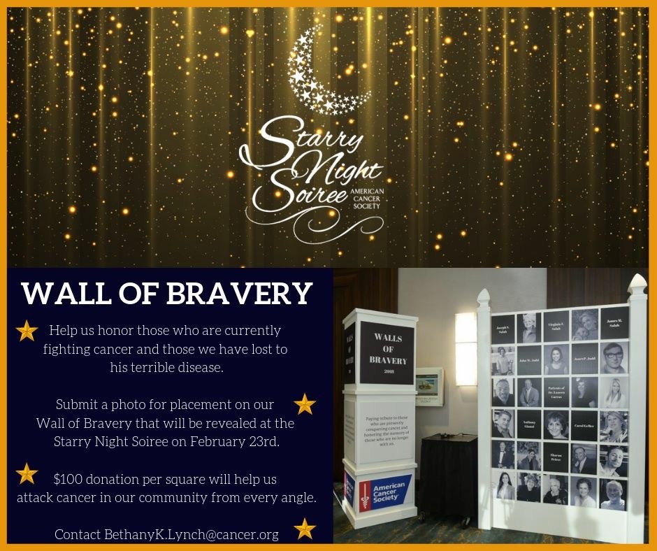 1 in 3 people will be diagnosed with cancer in their lifetime. You can honor someone that is currently fighting cancer or someone who has lost their battle with this horrible disease. For a donation of $100, you can feature a photo of the person you would like to honor on the Wall of Bravery which will be displayed at the at the upcoming Starry Night Soiree to benefit the American Cancer Society on February 23. Spaces are limited. Contact Bethany Lynch now at bethanyk.lynch@cancer.org to ensure your loved one is recognized at the upcoming Starry Night Soiree.