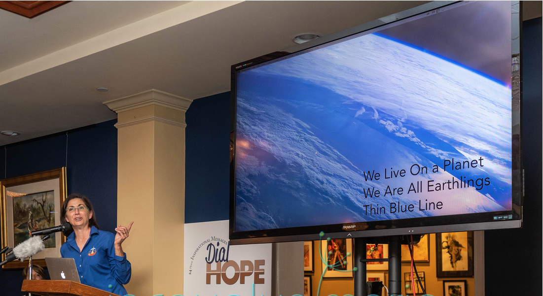 Rev. Dr. Roger Kunkel began Dial Hope by waking everyday at 5am to record a 2-3 minute uplifting telephone message. People began to call 24 hours a day, seven days a week. Dial Hope took off as a global telephone and Internet ministry providing daily faith-based, non-denominational dispatches. Today a growing nonprofit foundation with a board of directors, Dial Hope recently welcomed a NASA astronaut and artist as its keynote speaker to its Annual Luncheon at Bird Key Yacht Club. Only 561 people have been to space, 60 are women, and one of them is Nicole Stott from Clearwater. “Nicole’s inspirational message about humanity is a perfect fit for Dial Hope,” explains board member Ann Babcock.