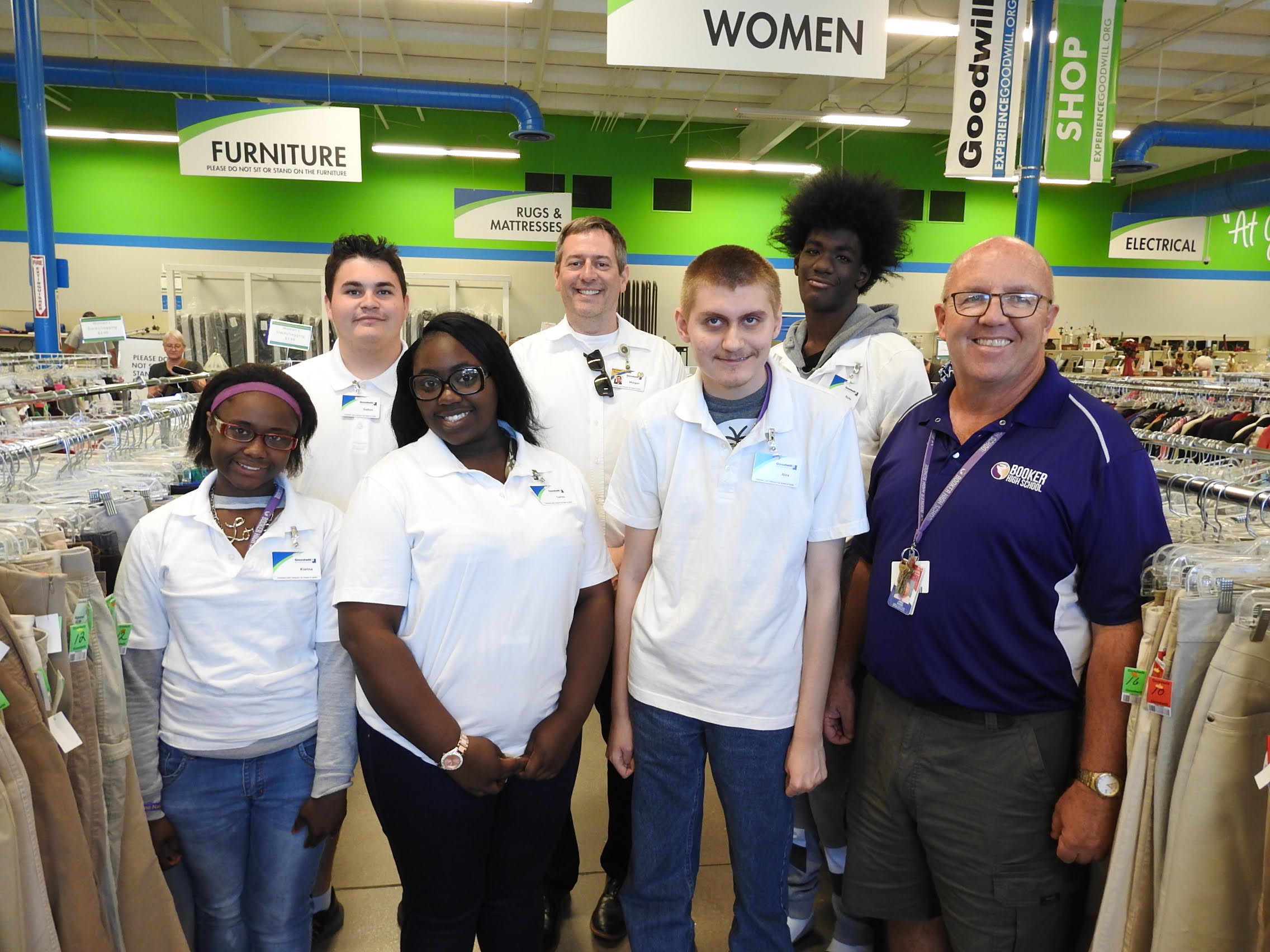 A partnership between Sarasota County Schools and Goodwill Manasota has enabled Exceptional Student Education (ESE) students from Booker High School to enjoy in-service training and job preparation skills at the Goodwill Mecca location in northern Sarasota. Seven students are learning on the job – five at a time, five days a week, for up to two hours each day – while earning school credit. Booker High School is just one of the schools participating in the Vocational Instructional Program, which is currently serving 34 ESE students, ages 16-22 / grades 10-12, with varying exceptionalities.