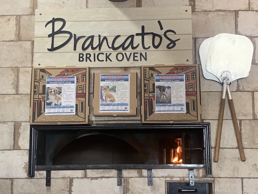 The concept of the campaign resembles that of missing persons on milk cartons, but much furrier and saucier. Brancato’s Brick Oven Pizza is the first pizzeria in Florida to put “Lost Dog” flyers on its boxes for takeout and delivery. So the next time you order the “Smokin’ Goodfella” pie, don’t worry about going home “to grab your shinebox,” just take your pizza box and go. But before breaking open the gangster contents in the cardboard—roasted red pepper cream sauce, melted smoked mozzarella, spicy Italian sausage, fresh garlic, red onion and basil, on a nod-worthy crust—take a mental note of the wet nose adhered to it and don’t you “Fuggedaboutit.” That puppy face has a famiglia who very much wants to be reunited. For family-owned Brancato’s, it was a no-brainer to partner with local nonprofit, Lost & Found Pets 941—understanding wholeheartedly how important family is. And “pets are family,” says Co-owner Alex Christianson, a dog owner himself. “Any part in reuniting them is fantastic for us, the owner and the pet.”