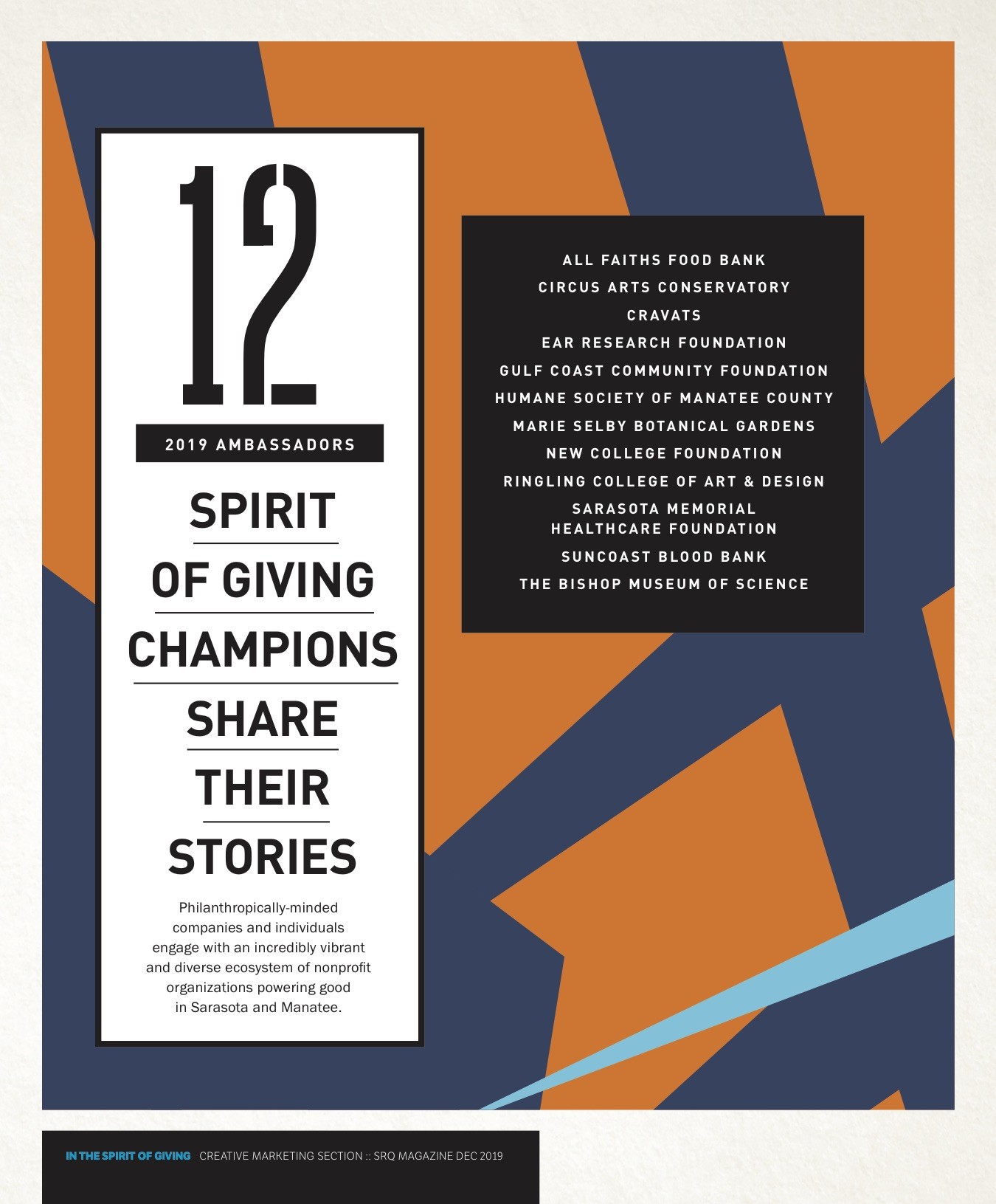 The Spirit of Giving special section highlights philanthropically-minded companies and individuals who engage with an incredibly vibrant and diverse ecosystem of nonprofit organizations in Sarasota and Manatee County. The feature was printed in our December magazine but is now available to view online. Kudos to these Giving Champions for the good work that they do in our community!