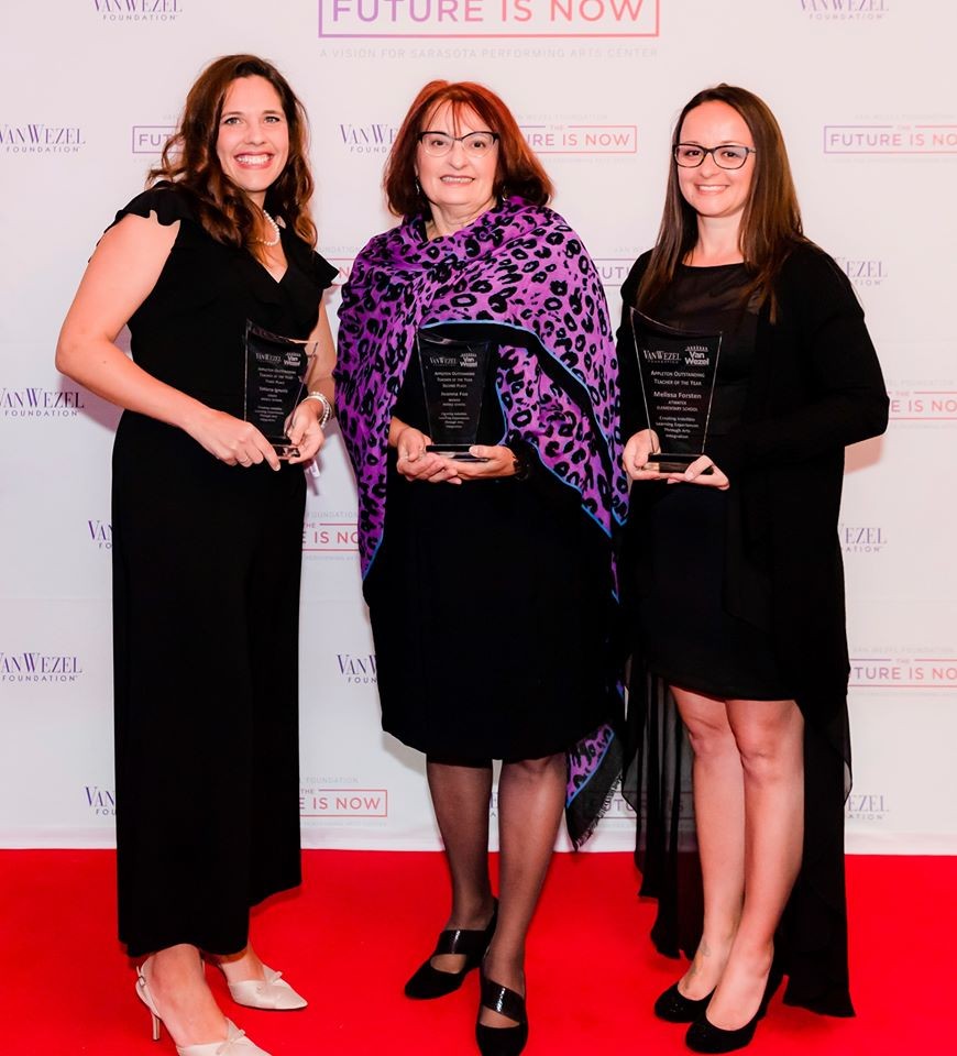 The Van Wezel Foundation and the Van Wezel Performing Arts Hall named three teachers from Sarasota County as this year's recipients of the Appleton Outstanding Teacher of the Year award, which celebrates the best in arts integration strategies in the classroom. These educators were recognized during the Foundation's 2020 INSPIRATION Gala held on February 21 at the Performing Arts Hall. The Award is made possible by an endowment to the Foundation from the late Mrs. Louise Appleton, a local philanthropist who had a passion for arts education and making a difference in the community. The 2020 Appleton Outstanding Teacher of the Year award was bestowed to Melissa Forsten, a first-grade teacher from Atwater Elementary in North Port who uses the performing arts to inspire her students to learn and educates other teachers on best practices and teaching techniques. With the award, Ms. Forsten is eligible to attend a professional development workshop in Washington, D.C., led by talented teaching artists at the John F. Kennedy Center for the Performing Arts. She also received a prize for an arts integration project and classroom teaching materials. Two additional educators were recognized for innovative applications of arts integration in the classroom, including Joanna Fox, a creative writing teacher from Booker Middle School in Sarasota, and Tatiana Ignotis, an ESOL instructor from Venice Middle School. Ms. Fox received funding for an arts integration project, and both teachers received prizing for classroom learning materials.