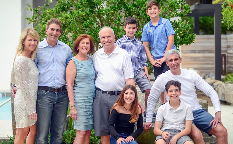 Three generations of the Rosenthal family: Courtney and Eric, Ed and Betty, Jonathan (seated), and grandkids Mia, Wes, Ace and Ari Photo by Daniel Perales Studio