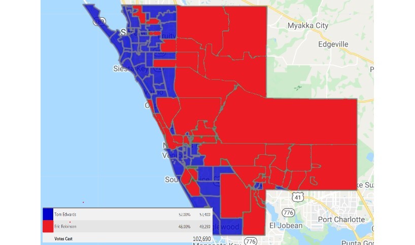 Much has been made of partisanship in Sarasota County School races. The defeat of incumbent School Board member Eric Robinson by Tom Edwards seemed to both sides a victory for Democrats Tuesday.