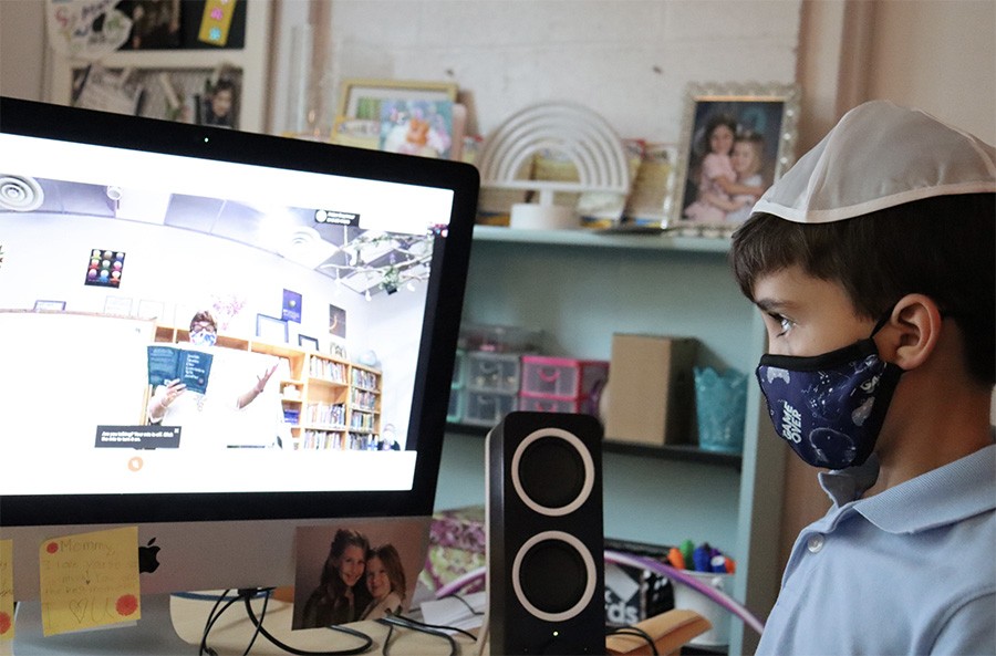 Pictured: Community Day School kindergarten student Matthew Dobson follows the action virtually as Rabbi Anat Moskowitz leads Shabbat services.