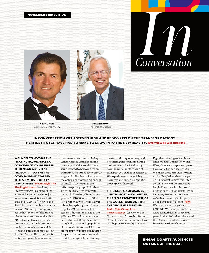 Now available to view and download, SRQ Magazine's November 2020 In Conversation With features a lively discussion with Steven High of The Ringling Museum and Pedro Reis of The Circus Arts Conservatory on the transformations their institutes have had to make to grow into the new reality.