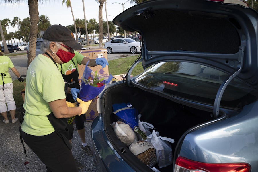 In response to increased need and in order to brighten the holidays for community members who are struggling, All Faiths Food Bank will distribute thousands of turkeys and side dishes to those who are facing hunger with multiple distributions through November 24. The turkey distributions kicked off on November 7 with an event hosted by The Bay Park Conservancy and Van Wezel. Cars started lining up well before 8am. All Faiths distributed just over 700 turkeys (with side dishes as well as lovely bouquets of flowers to brighten everyone's day). Recipients came primarily by car but there were some on bikes and others on foot. All were grateful for the help in these challenging times.