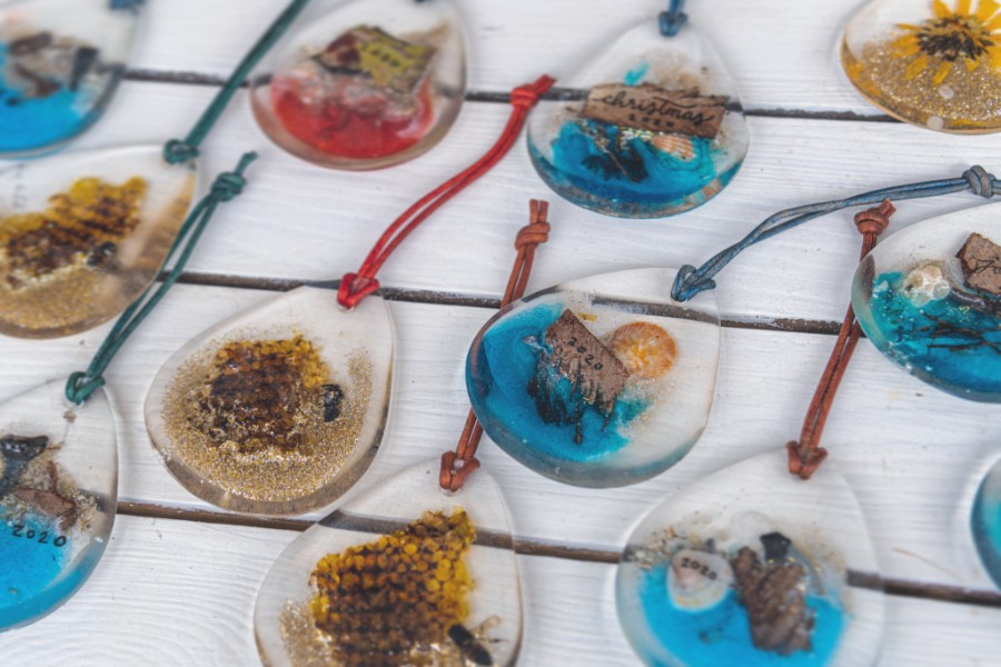 Odds are, many of you took the liberty to go out and find your Christmas tree this week with traditional festivities, lights and familiar tunes and movies commencing this wonderful time of year. And if upon setting your carefully-chosen tree up, and decorating it with the same box of aged-old adornments, you notice some barren branches and empty space just begging for a new ornament to be hung, consider supporting small business this holiday season by investing in a locally-made one filled with native treasures of the Gulf Coast. These handcrafted ornaments come ready to hang on colored rope with resin-poured pendants--no two exactly the same. Inspired by the tropical, coastal landscape here, owner and founder of Driftheory, Danielle Ferrantino, captures the essence of Sarasota's natural beauty by foraging and collecting various materials and preserving them within the hardened resin. Notice recycled palm tree bark, sand, seashells, wildflowers, coral, mica shimmers and even honeycomb that was gifted to Ferrantino from a local beekeeper at Myakka's Gold Apiary.