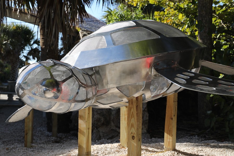 An innovative and educational new turtle sculpture now greets beachgoers at Venice Beach. The public artwork—a gift to the City of Venice from Gulf Coast Community Foundation—was unveiled today by representatives from the City and the foundation at a small, socially distanced outdoor event. The larger-than-life aluminum turtle will double as a receptacle to display plastic and aluminum recyclables, helping to teach visitors about the dangers of plastic marine debris and the benefits of recycling.“We want to fill this turtle with plastic that might otherwise be left on the beach and end up in the Gulf of Mexico, so that real sea turtles and other wildlife out there don’t swallow it instead,” said Jon Thaxton, senior vice president for community investment at the foundation. “Our local economy and quality of life depend on clean, healthy waterways and vibrant sea life. This stunning piece of art will also teach vital lessons in conservation.”