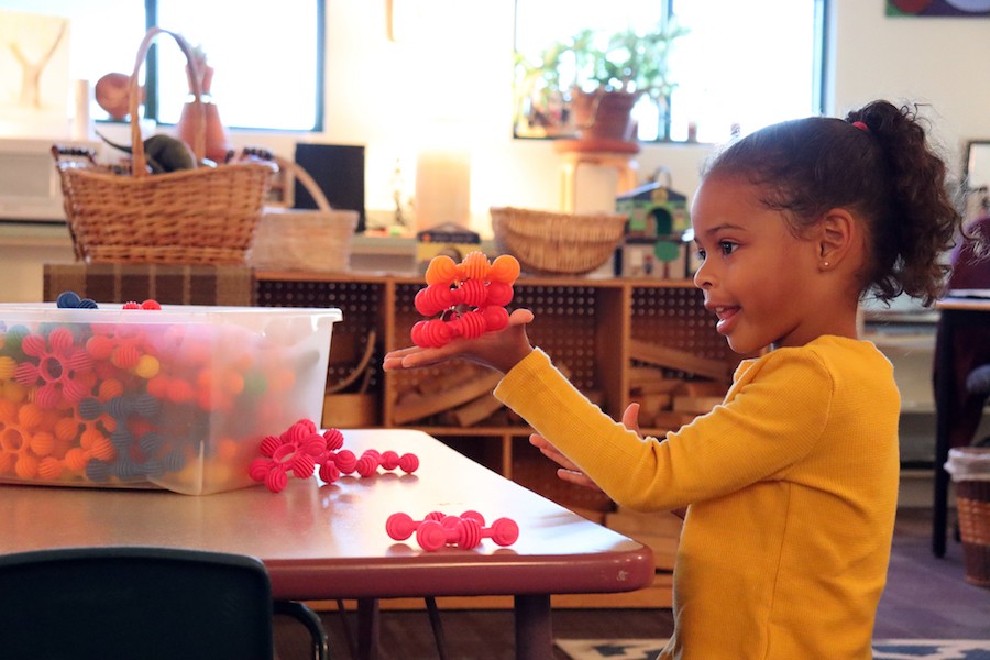 Pictured: Community Day School preschooler Analise Gallant gets hands-on with a building activity