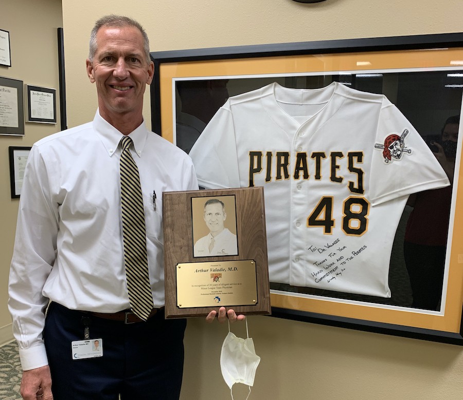 Board-certified orthopedic surgeon and sports medicine specialist Dr. Arthur Valadie with Coastal Orthopedics, a full-service provider of comprehensive orthopedic surgery, sports medicine, spine care, pain management and physical therapy services, recently received a 20 years of service recognition award from the Professional Baseball Athletic Trainers Society (PBATS).