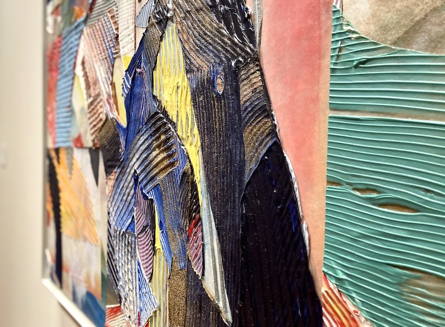 Slanting (1993, acrylic and collage on panel) serves as a fitting synopsis of his style and hangs at the entrance to the exhibition space. Composed of thickly applied acrylic paints on dozens of pieces of paper, Gilliam manages to wield chaos and order with an even hand. The different pieces of paper collaged together give each color its own distinct place in the whole, and even on the piece’s right hand side, where black and salmon and green share an edge, there’s a unity of vision that shows careful deliberation.
