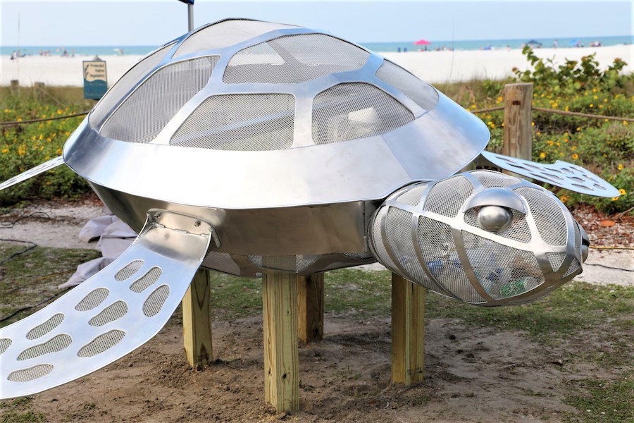Gulf Coast Community Foundation recently gifted a second aluminum sea-turtle sculpture for a Sarasota County beach—this time, Siesta Beach. Leaders from Gulf Coast and Sarasota County unveiled the larger-than-life environmental artwork last Saturday before a socially distanced crowd near the main beach pavilion. Installed close to Siesta Beach’s popular postcard “selfie” sign, the new addition aims to raise awareness of the hazards of marine debris to our local waterways and wildlife. Gulf Coast commissioned the sculpture as a gift to Sarasota County in honor of the foundation’s 25th anniversary. The Siesta turtle—along with a sister sculpture at Venice Beach—was conceived and constructed by artists at Asolo Repertory Theatre’s Koski Center.