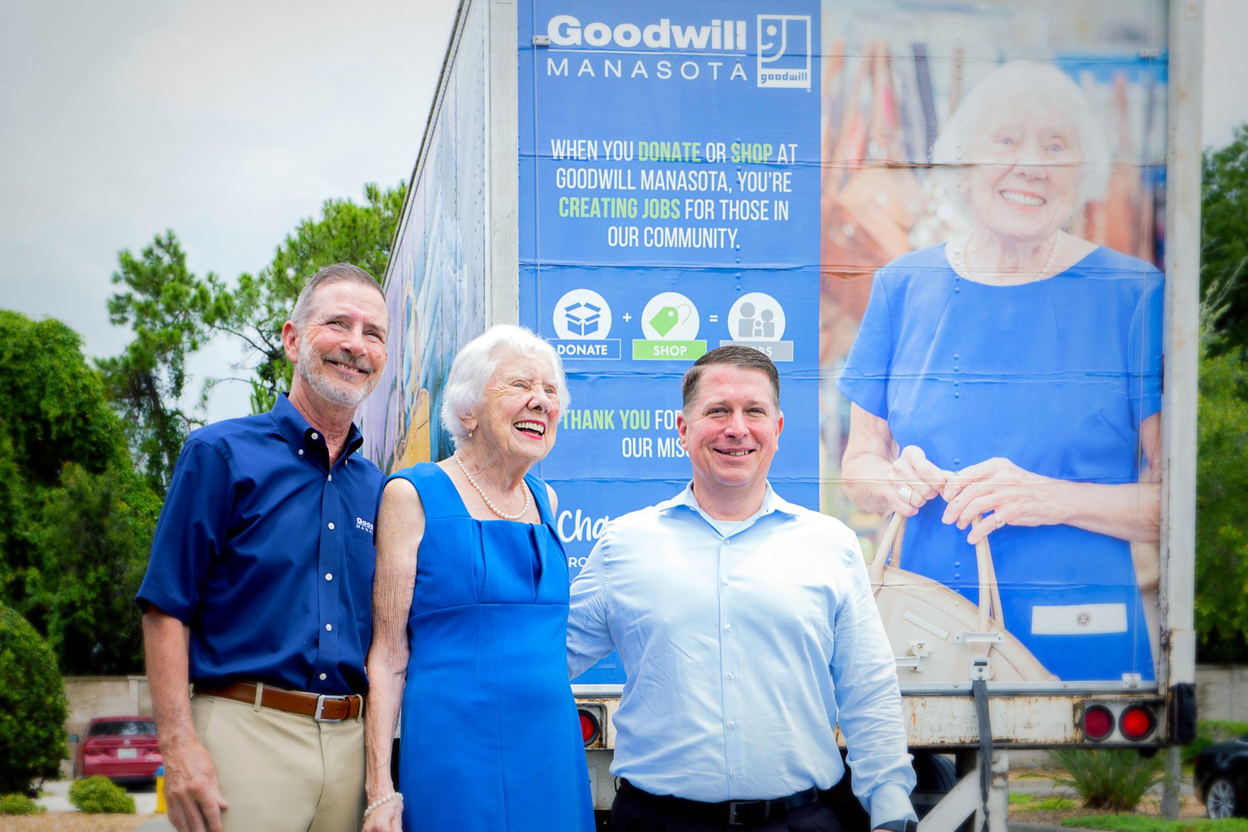 Pictured: (From l-r) Goodwill Manasota President and CEO Bob Rosinsky, longtime volunteer Jo Rita Stevens, and Vice President of Operations Donn Githens during the unveiling of 'Jo Rita's' truck