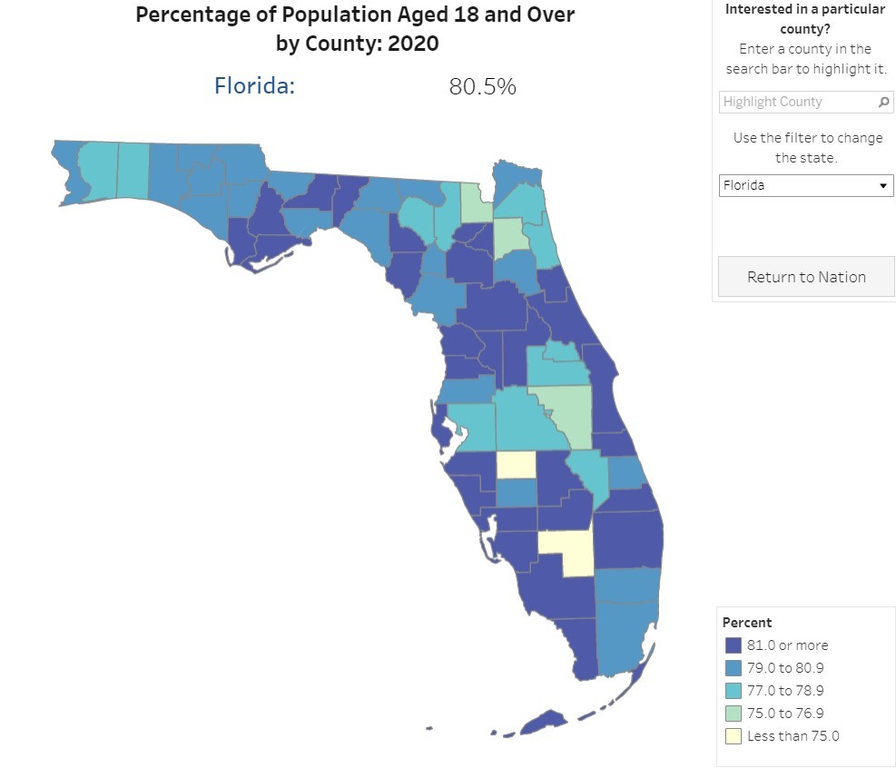 But Manatee is a different story. About 81.7% of the population there is over age 18. That puts it at No. 23 among Florida counties, still on the high end of agedness but still with a fair share of family and kids. Now, the percentage of children still dropped over the decade, from 20.5% in 2010 to 18.3% in 2020. But it’s still closer the statewide makeup of 80.5% adults, 19.5% kids. Nationwide, 77.9% of all residents are over the age of 18.