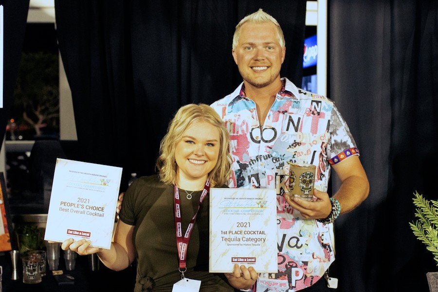 The Sarasota-Manatee Originals network promotes and sustains over 60 independent area restaurants and provides diners with a comprehensive resource of some of the finest locally-owned keepsakes throughout Florida’s Suncoast. Remember to “Eat Like A Local” and check out eatlikealocal.com or @941originals socials for restaurant updates, promotional deals and upcoming events.Pictured: Bartender Rhiannon Mahon celebrating two wins for her Hiatus Tequila cocktail, alongside one of the event's judges Brandon Weppner. Photo taken by Zach Dauth