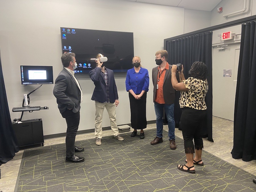 Pictured: Ringling College student Joseph Janssen stands amongst VR faculty with a headset on to demonstrate the new technology's application to cancer treatment.