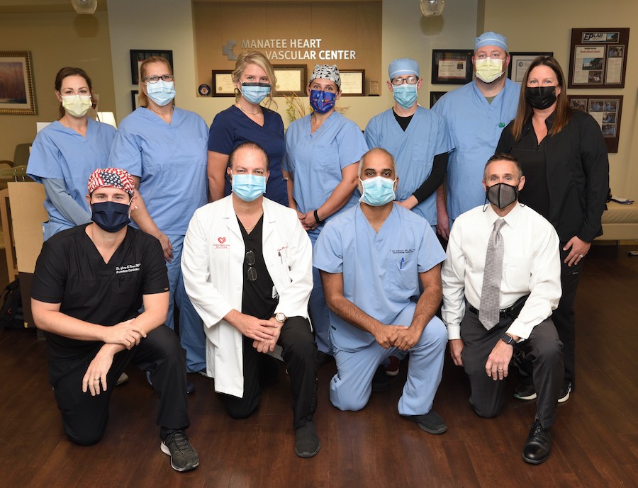 Manatee Memorial Hospital is now offering severely calcified coronary artery disease patients a new treatment option that uses sonic pressure waves to safely break up calcium blockage that can reduce blood flow in the heart. The new shockwave technology, also known as intravascular lithotripsy or IVL, allows physicians to fracture the problematic calcium - using sonic pressure waves - so that the artery can be safely expanded, and blood flow is restored with the placement of a stent and without unnecessary complications. S. Jay Mathews, MD, performed the first case with the Heart and Vascular team in August. James Nguyen, MD, Anthony Pizzo, MD, Enrique Rivera, MD, Jeffrey Rossi, MD, and Gino Sedillo, MD, are also trained in this procedure. Currently the hospital has completed 55 procedures. Heart disease is the leading cause of death for both men and women. Each year, more than 600,000 people in the United States die of heart disease. As people with heart disease, specifically coronary artery disease, grow older and their disease progresses, plaque in the arteries evolves into calcium deposits, which can narrow the artery. Physicians often use stents to open an artery, and of the approximately one million patients that undergo a stent procedure each year, 30 percent have problematic calcium that increases their risk for adverse events. Calcium makes the artery rigid and more difficult to reopen with conventional treatments, including balloons, which attempt to crack the calcium when inflated to high pressure, and atherectomy, which drills through the calcium to open the artery. While atherectomy has been available for several decades, its use remains low, as it can result in complications for patients who are undergoing stent procedures.