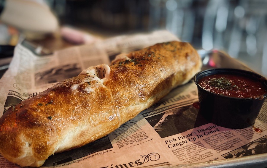 Once they pass that toothy crucible, any difference between the two vanishes. At Pizza N’ Brew on Main Street, both the calzone and Stromboli (pictured) come stuffed with cheese—ricotta in the former and mozzarella in the latter—and are surrounded by an exquisitely baked, egg washed pizza dough seasoned with fresh herbs. The Stromboli looks like the fever dream of a fasting monk, glistening with the comfort and joy of a pizza while evoking the sublime safety of fresh bread. When dipped in the housemade marinara, the difference between a Stromboli and calzone (and pizza, for that matter) is a distinction that might not be worth making. And certainly not when both start at $8.